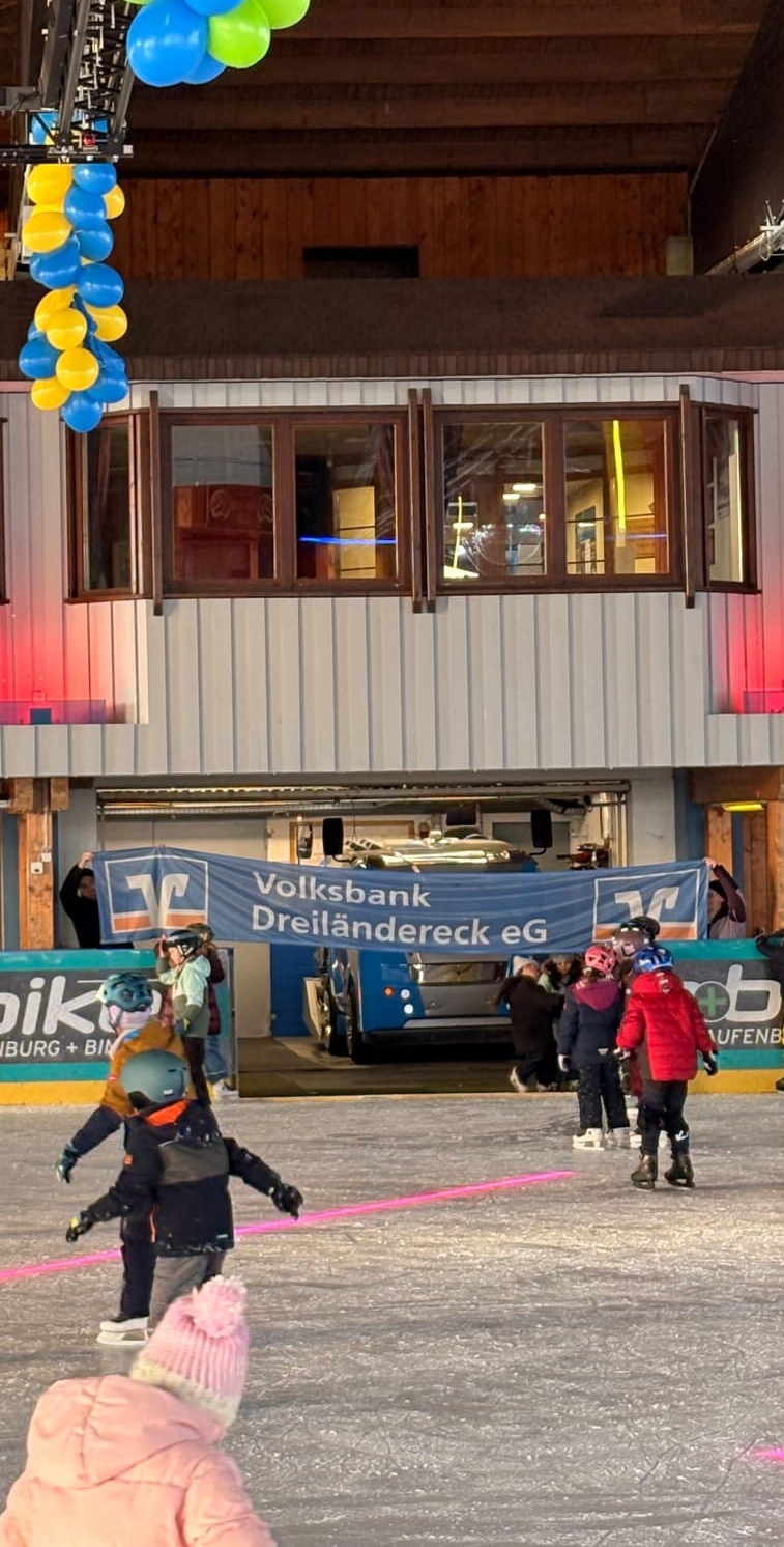 Fast konnte man die Kinder am Morgen des 05. Februars auf dem Schulhof nicht erkennen. Dick eingepackt in Schneeanzüge, bepackt mit Helm, Mütze und Handschuhen standen die Kinder bereit, um sich auf den Weg zur Eisshalle in Herrischried zu machen. In zwei Gruppen fuhren die Kinder mit ihren Lehrerinnen und Lehrern sowie hilfsbereiten Eltern mit Bussen nach Herrischried. Dort konnten Anfänger mit Pinguinen ihre ersten vorsichtigen Schritte aufs Eis wagen. Mutigere Kinder zogen ihre Kreise in der Mitte der Eisfläche und auf dem letzten Drittel bildeten sich zwei Mannschaften, die gegeneinander Eishockey spielten. Strahlende Augen in müden Gesichtern gab es am Ende dieses Schultages.